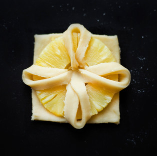 Ciasto rozwałkuj na grubość 2mm. Wytnij kwadraty 9x9cm (po położeniu na nim krążka owocu musi zostać rant na 1-1,5 cm). Na środku każdego ciastka połóż plaster ananasa. Ostrym nożem natnij każdy róg kwadratu (jak na zdjęciu).