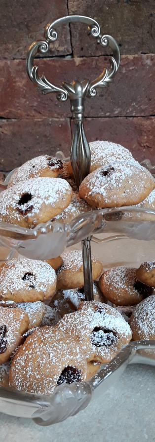 Na blachę wyłożoną papierem do pieczenia wykładaj porcje ciasta. Ciasto jest trudne do formowania. Ja użyłam do tego dwóch łyżek. Jedną nabierałam ciasto, drugą zsuwałam je na blachę. Na części ciasteczek poukładałam orzechy włoskie. Niektóre nadziałam powidłami śliwkowymi, a pozostałe zostawiłam bez dodatków, aby po upieczeniu polać je lukrem cytrynowym.
