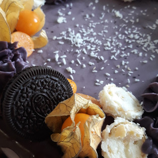 W środku masa malinowa z frużeliną z czarnej porzeczki, oreo oraz masa brzoskwiniowa.